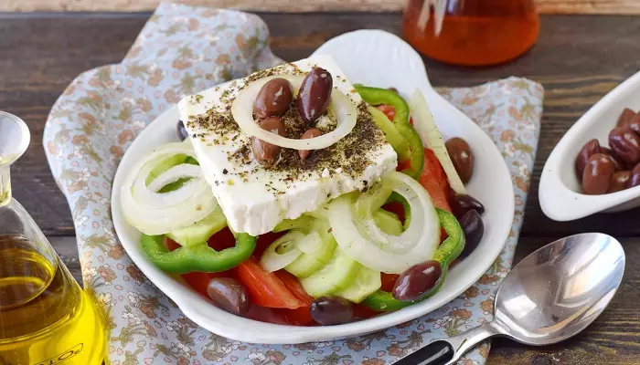 سالاد یونانی (Horiatiki): سالاد اصیل یونانی برخلاف تصور رایج، کاهو ندارد و از گوجهفرنگی، خیار، پیاز، زیتون کالاماتا و یک تکه بزرگ پنیر فتا تشکیل شده و با روغن زیتون و پونه کوهی طعمدار میشود.