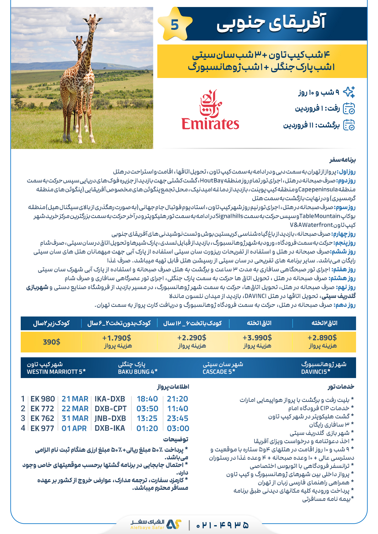 نکته: خدمات 20کیلو اضافه بار رایگان در پرواز داخلی ! تاریخ سفر: 1 فروردین / 4شب کیپ تاون+ 3شب سان سیتی + 1شب پارک جنگلی+1شب ژوهانسبورگ / با پرواز امارات