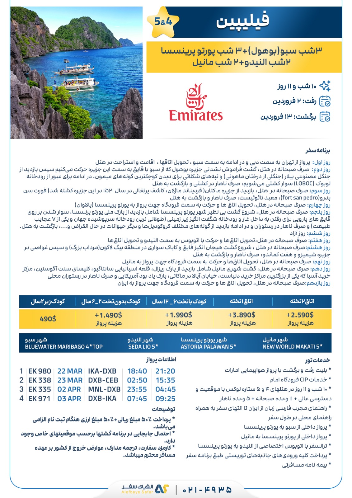 تاریخ سفر: 2 فروردین / 3شب سبو (بوهول) + 3شب پورتو پرینسسا + 2شب النیدو + 2شب مانیل / پرواز امارات