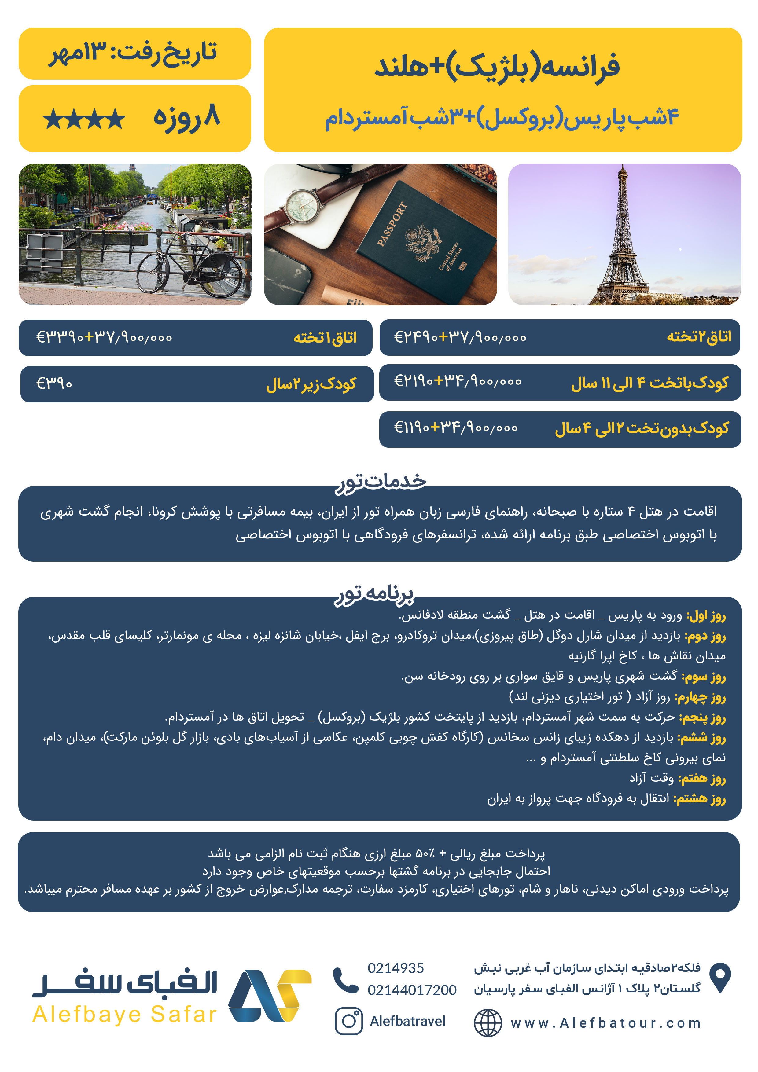 تور فرانسه هلند از تهران 7 شب و 8 روز قیمت ویژه پاییز+ ارائه سایر مسیرهای اروپا ⭐️  ✅ با آژانس الفبای سفر